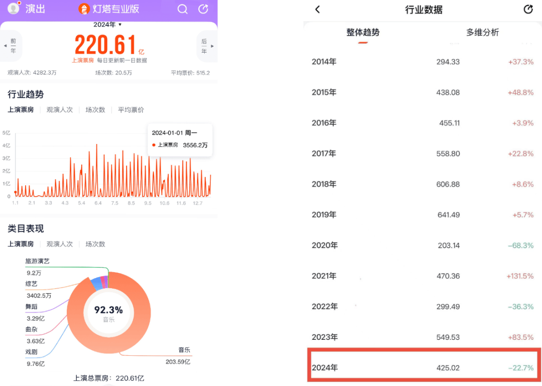 数据揭示了演出市场的爆炸性增长。根据灯塔专业版数据,2024年中国演出行业出票票房收入达到220亿元,涨幅高达85%,其中90%由音乐演出贡献。