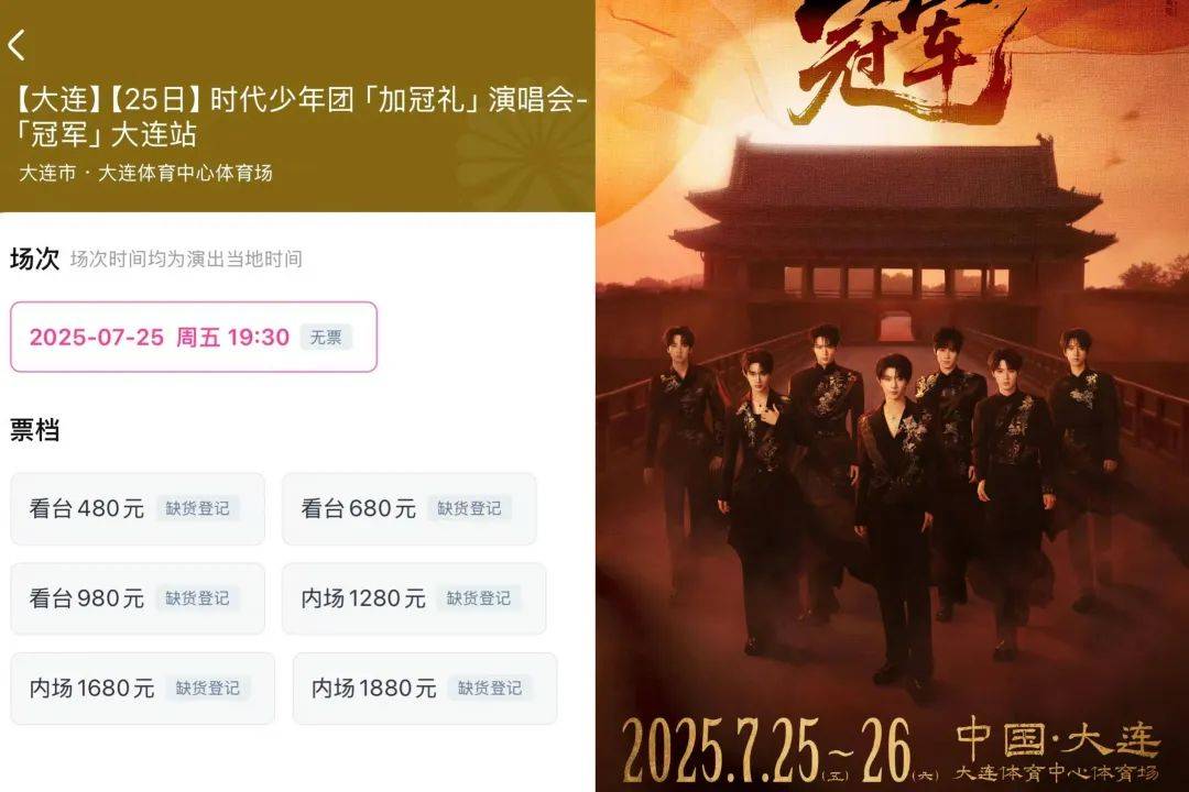 与此同时,大连体育中心上演着另一场狂热。时代少年团“加冠礼”演唱会开票时,31270张门票引发93万人同时抢票,大麦网服务器因流量过载陷入瘫痪。首场3万张门票仅18秒售罄,内场第一排座位在二手平台被炒至28888元。